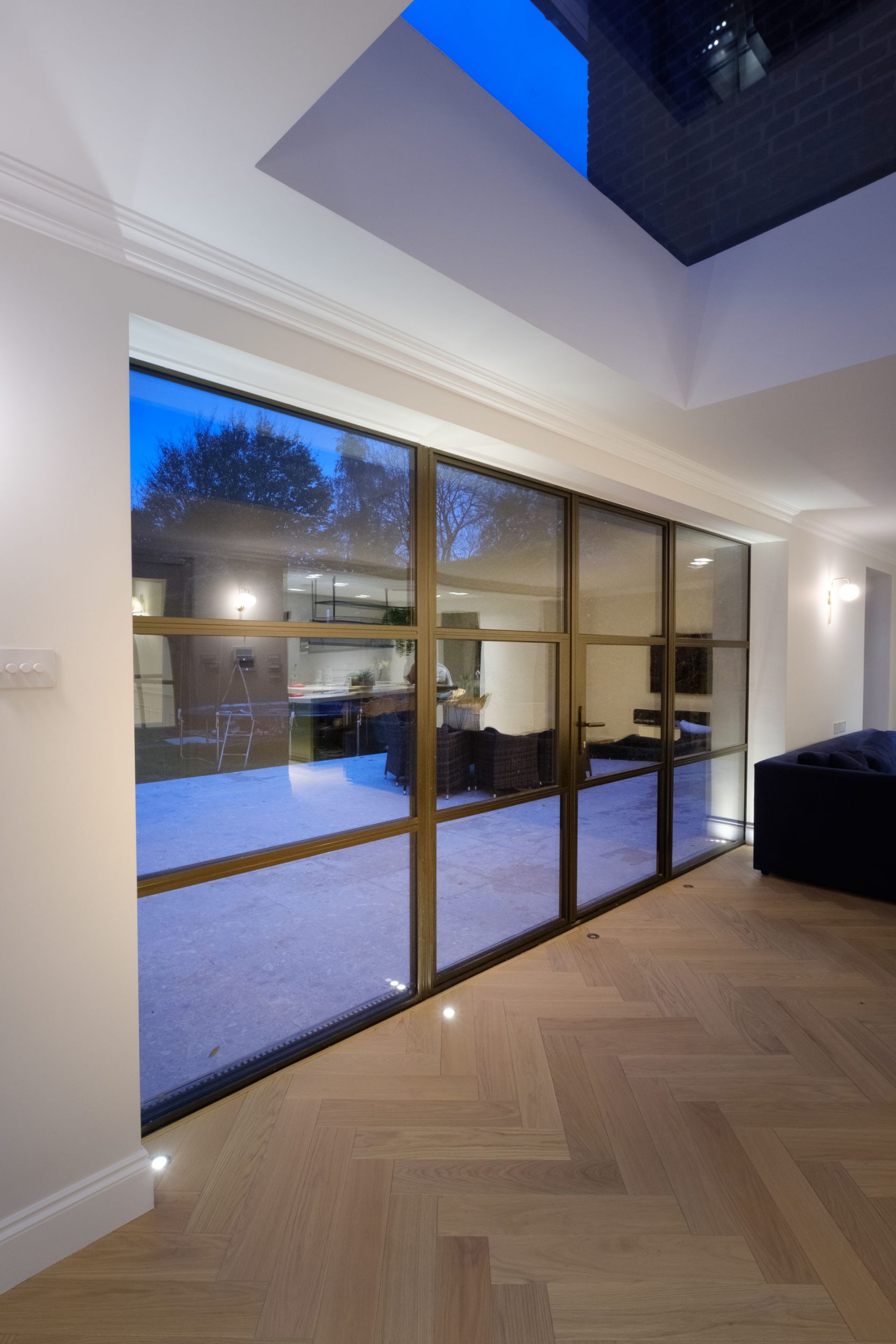 The copper tones of the aluminium framing were used across all the glazing systems to create a cohesive finish to the ground floor rooms. This colour compliments the red tones of the external exposes red brick work to create a beautiful external facade to the property.